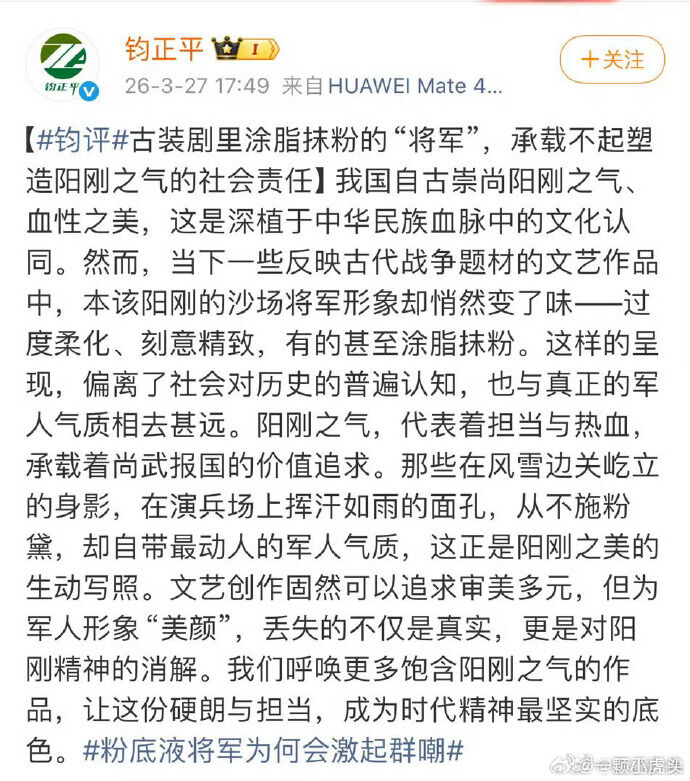 軍」,軍媒「鈞正平」罕見批評「古裝劇『塗脂抹粉的將軍』過度柔化,消解陽剛精神承