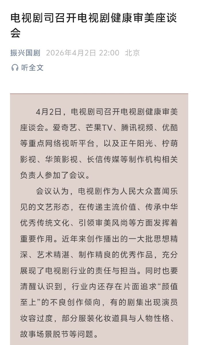 會議中明確提出「堅決摒棄畸形審美」的指導意見,並要求戲劇製作實現從「明星中心制
