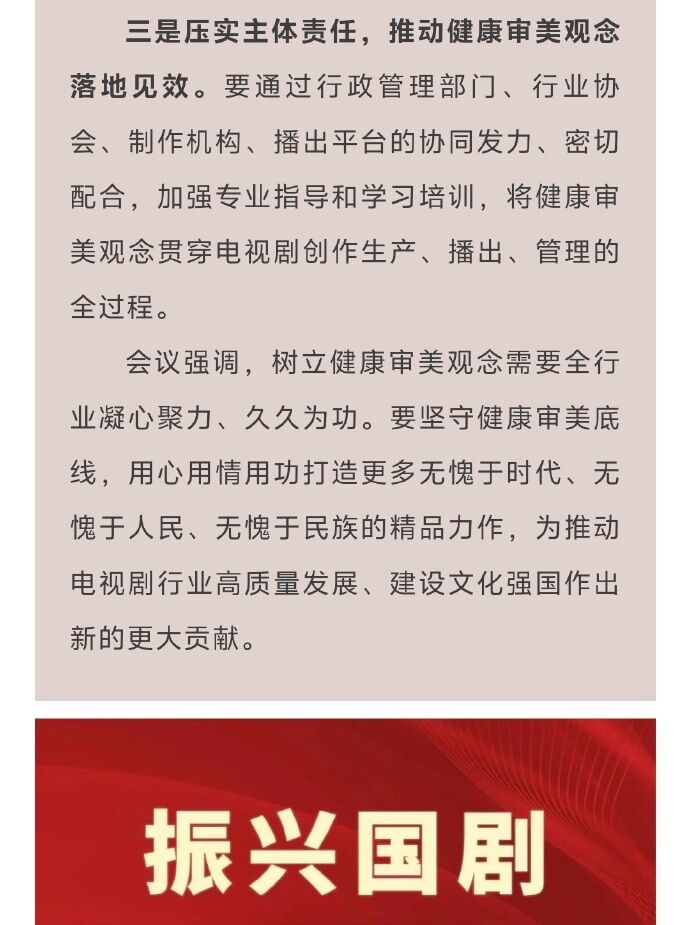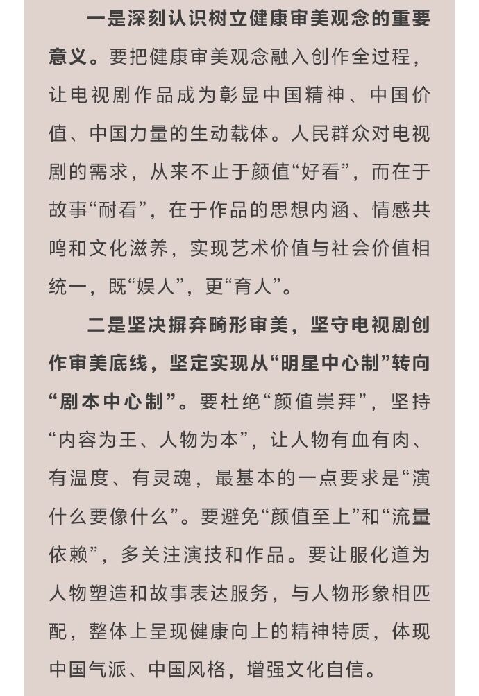 立健康審美」。接著要求戲劇製作「杜絕顏值崇拜」與「流量依賴」,強調人民群眾的需