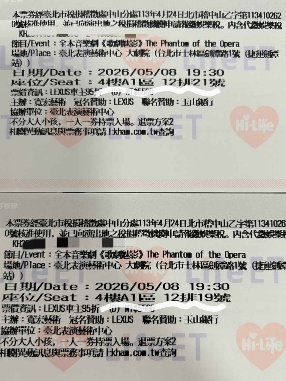 [售票] 歌劇魅影 5/8 19:30 5880*95折