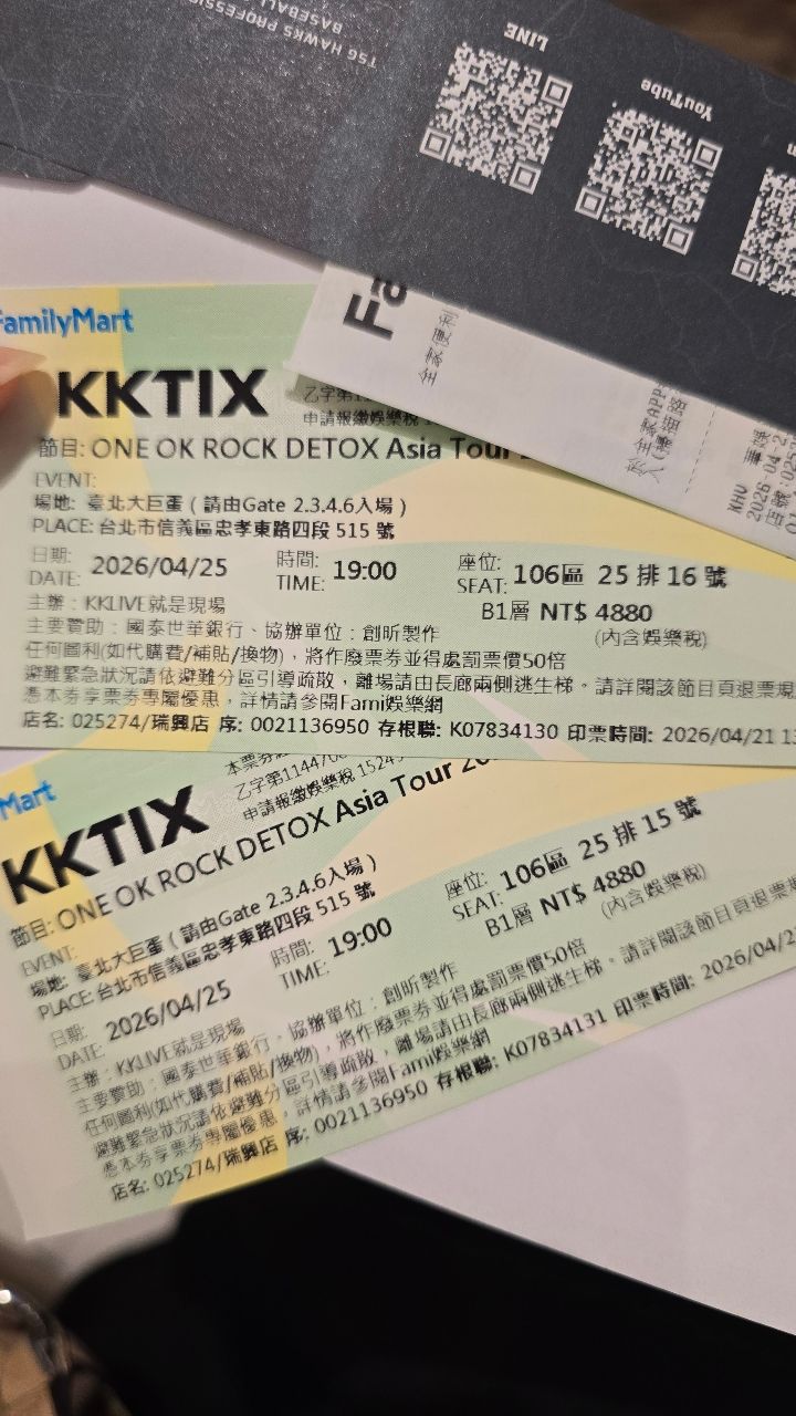 [售票] ONE OK ROCK 4/25 4880(106區)휱 or 2張
