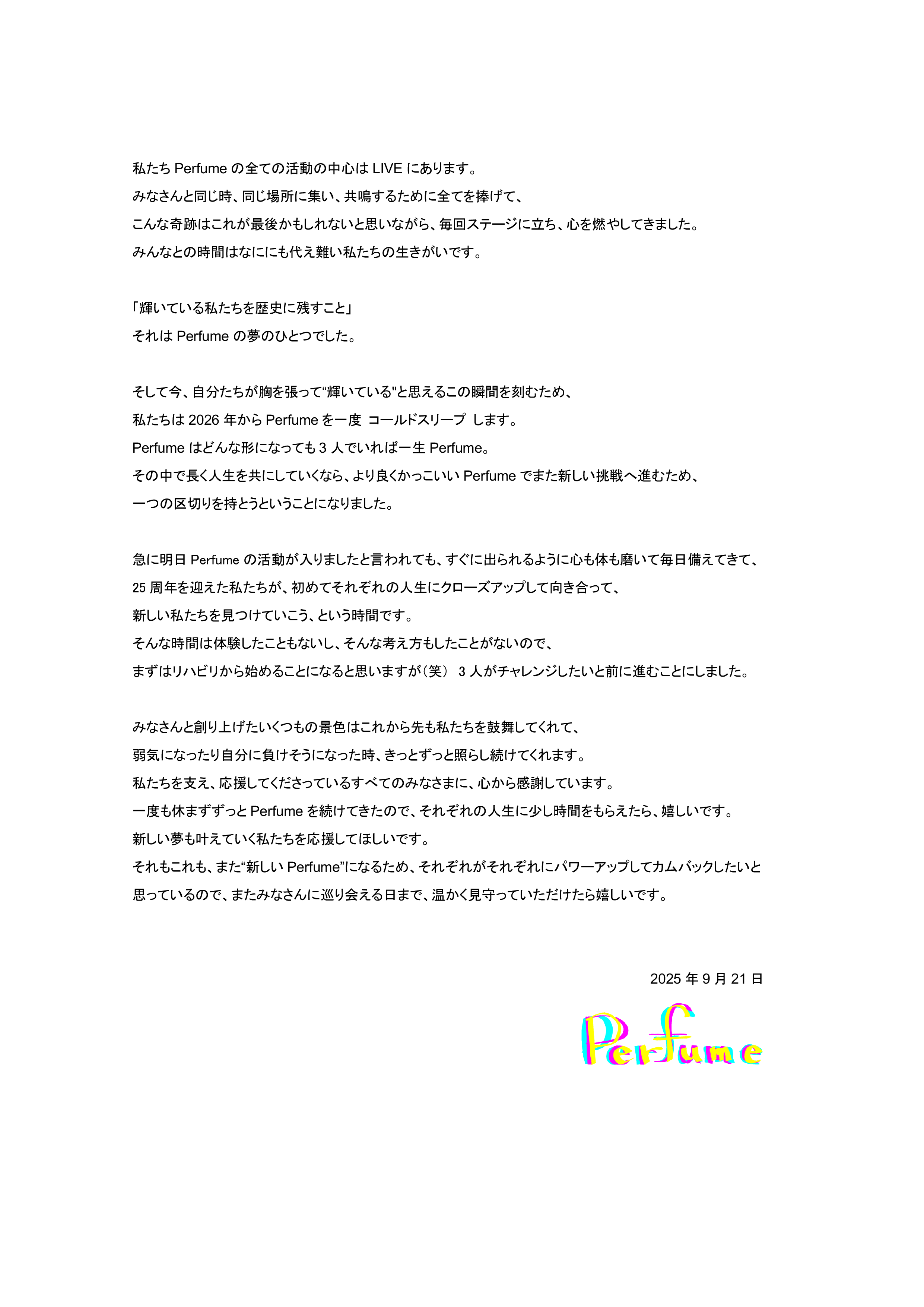 Perfume 也暗示未來的復出可能性:「我們希望能以更強大的姿態回歸,直到再次與大家