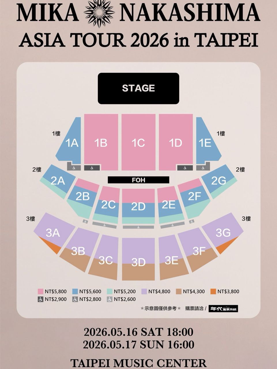 KA NAKASHIMA ASIA TOUR 2026」,台北站門票票價為新台幣5800元、5600元、5200元、4