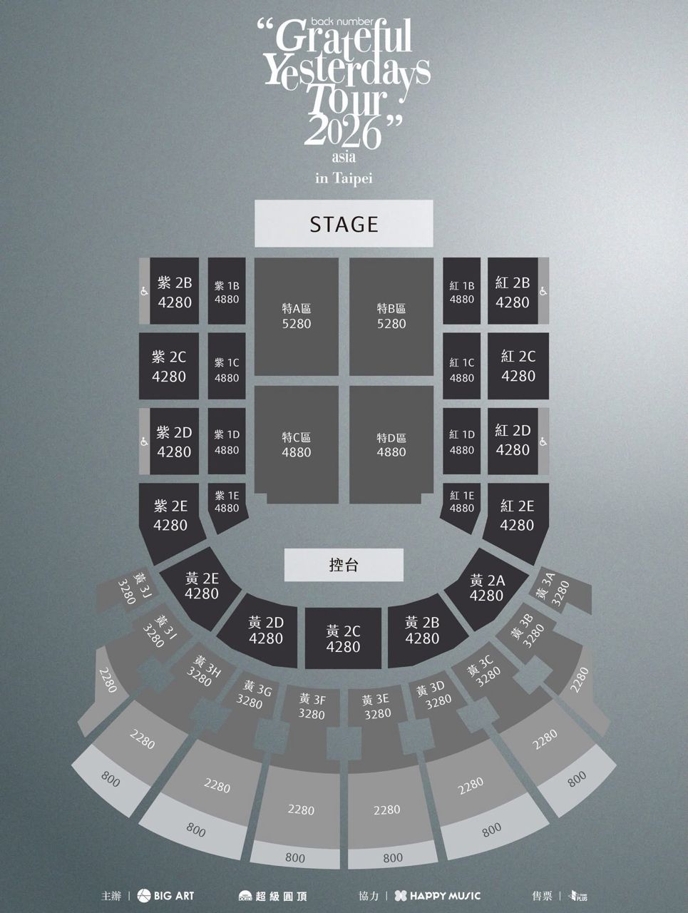 |票 價:NT$ 5,280 / NT$ 4,880 / NT$ 4,280 / NT$ 3,280 / NT$ 2,280 / NT$ 80