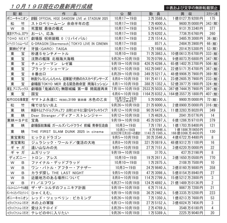 ║14║—║THE FIRST SLAM DUNK 2025 in cinema ║3║ 0.3億║ 1.1億║