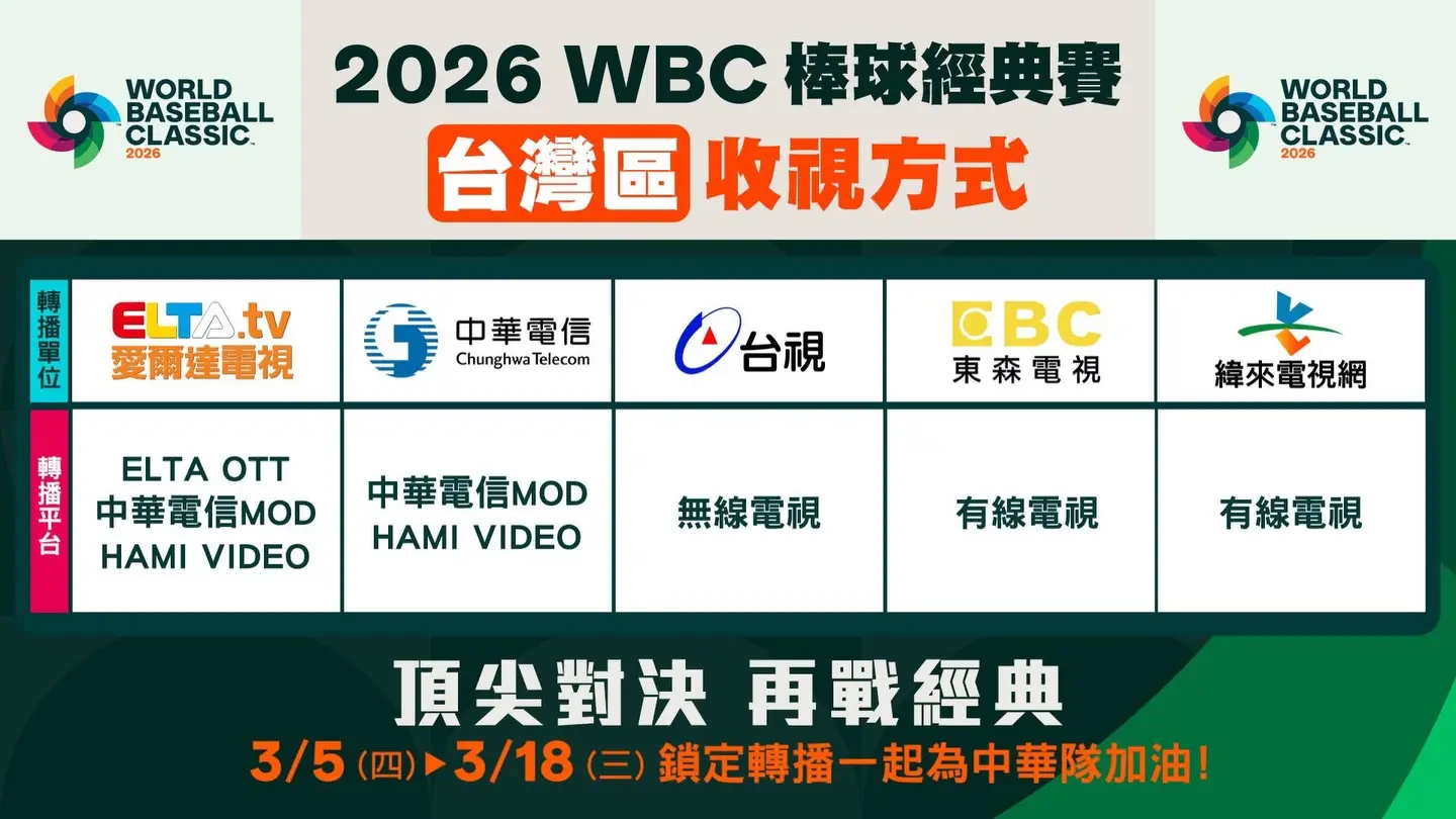 (World Baseball Classic 2026, WBC) 於今年三月舉行之47場賽事轉播權;