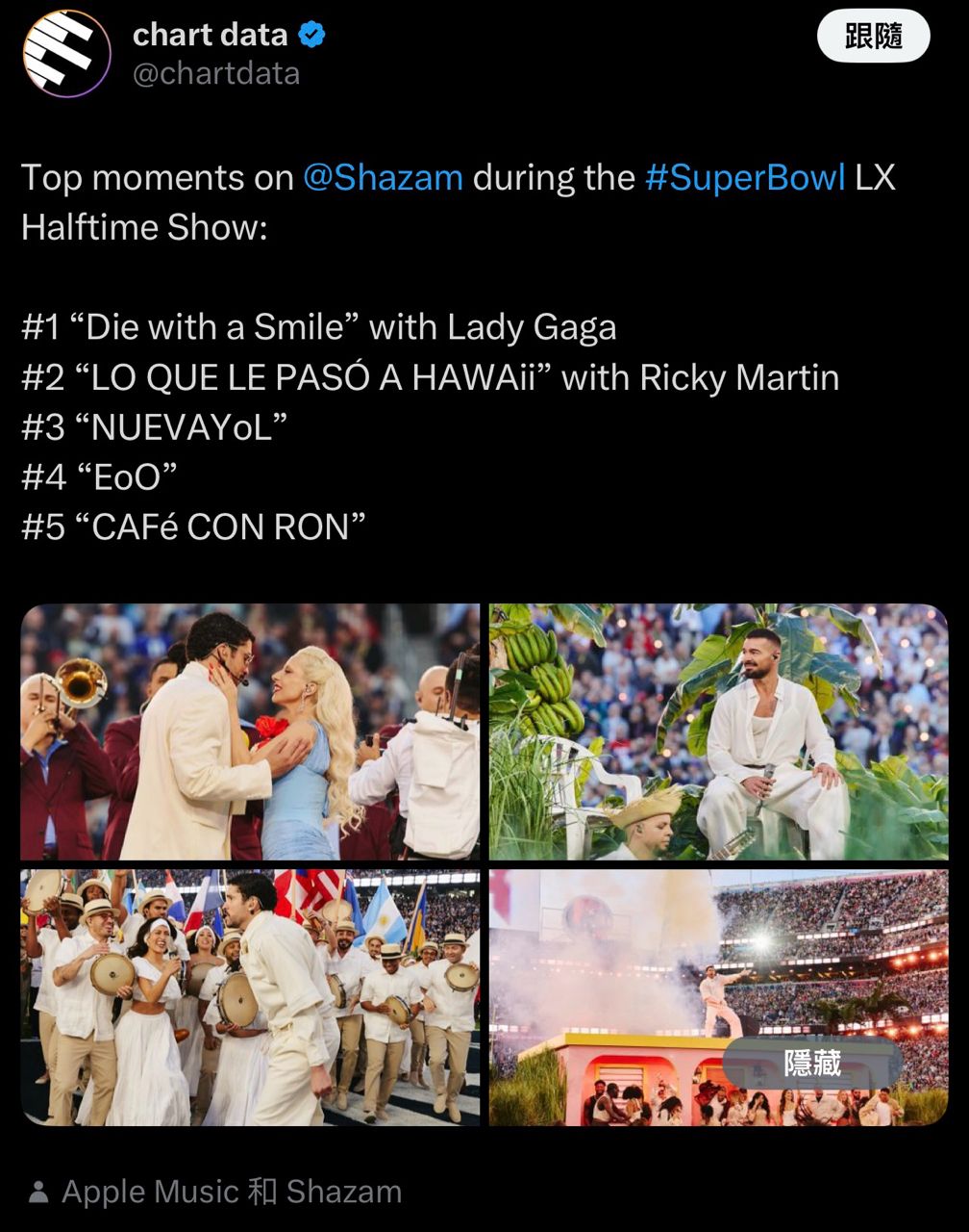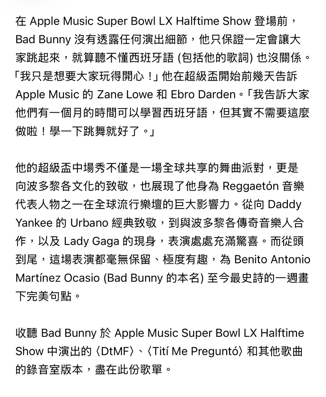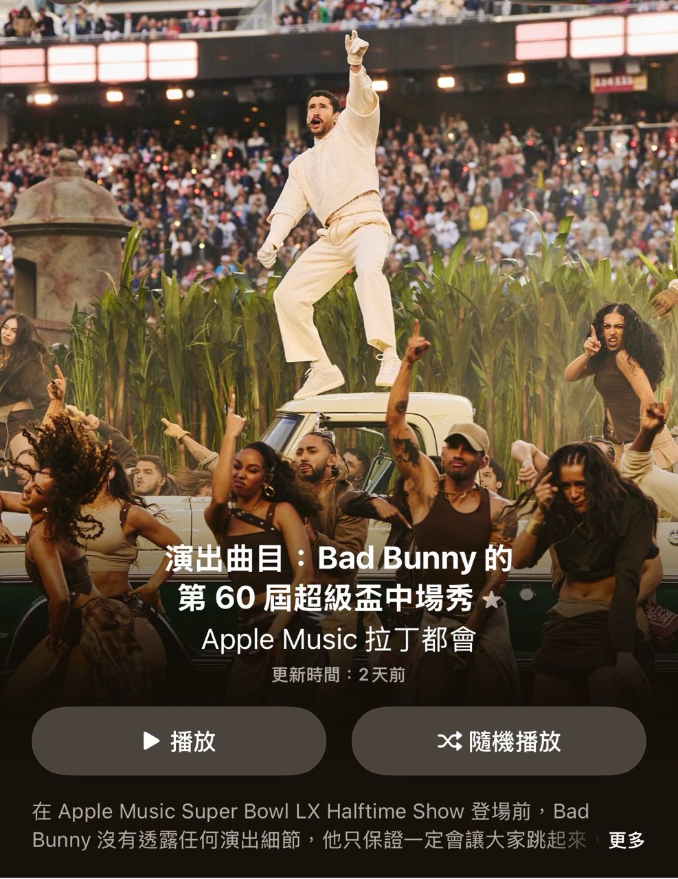 NFL第60屆超級盃第(Super Bowl LX),Bad Bunny於Apple Music中場秀登場,帶來一場