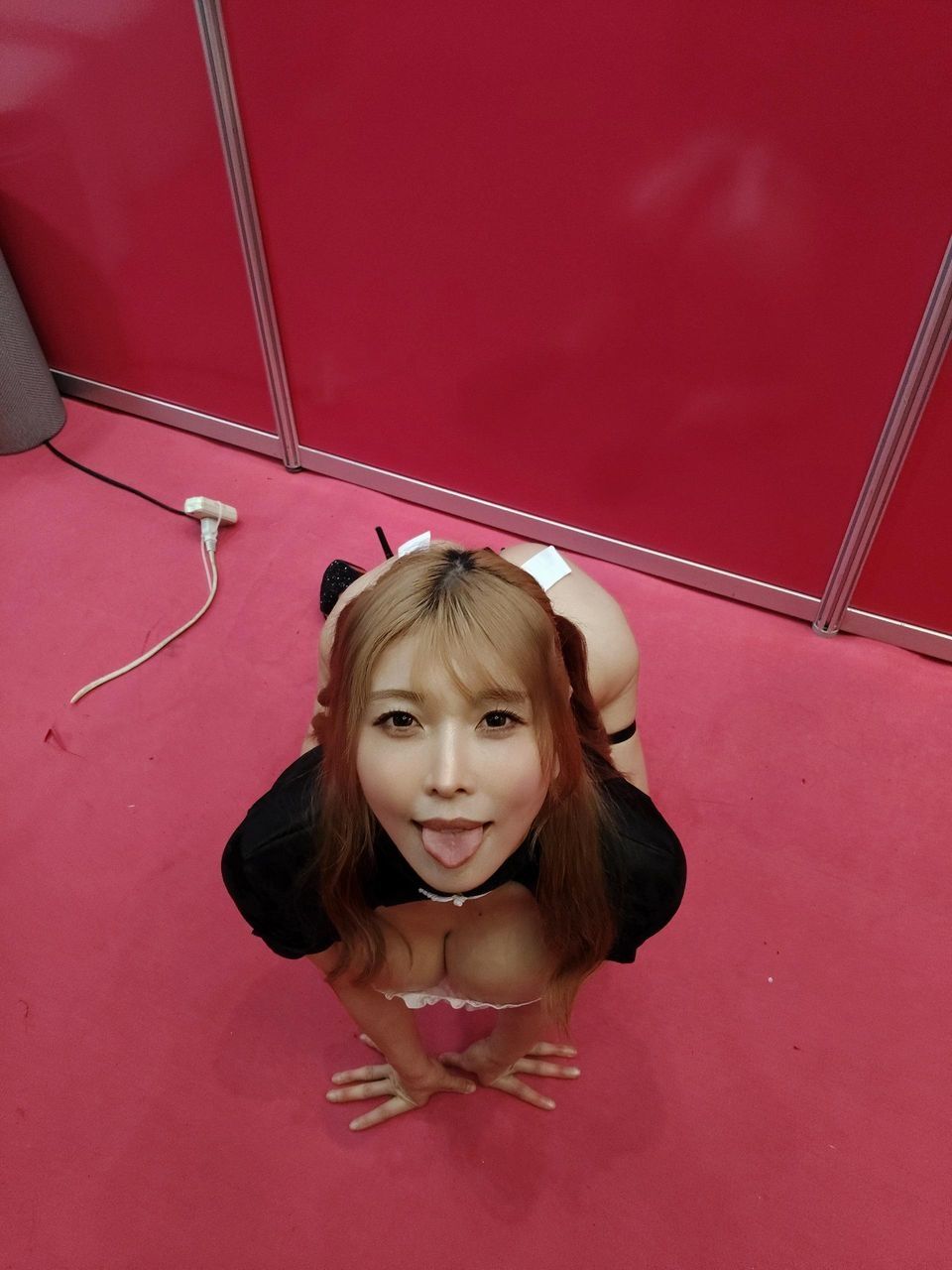 乳店情境模擬。她完全不扭捏就在攤位外直接坐在椅子上雙腿大開,讓客人把臉埋進雙腿