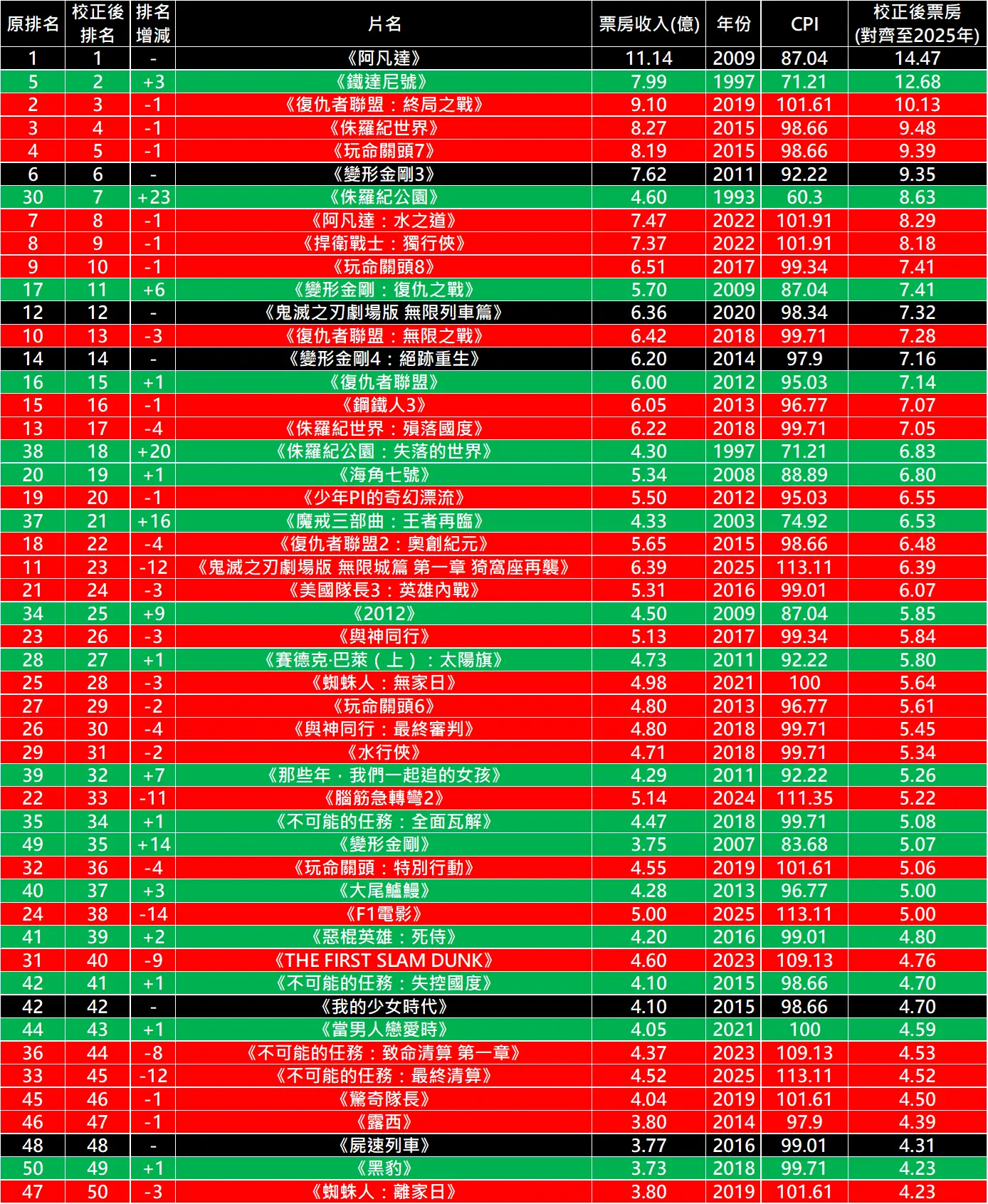 用上映年份的CPI重新計算票房,並對齊到2025年7月的CPI,得到下表