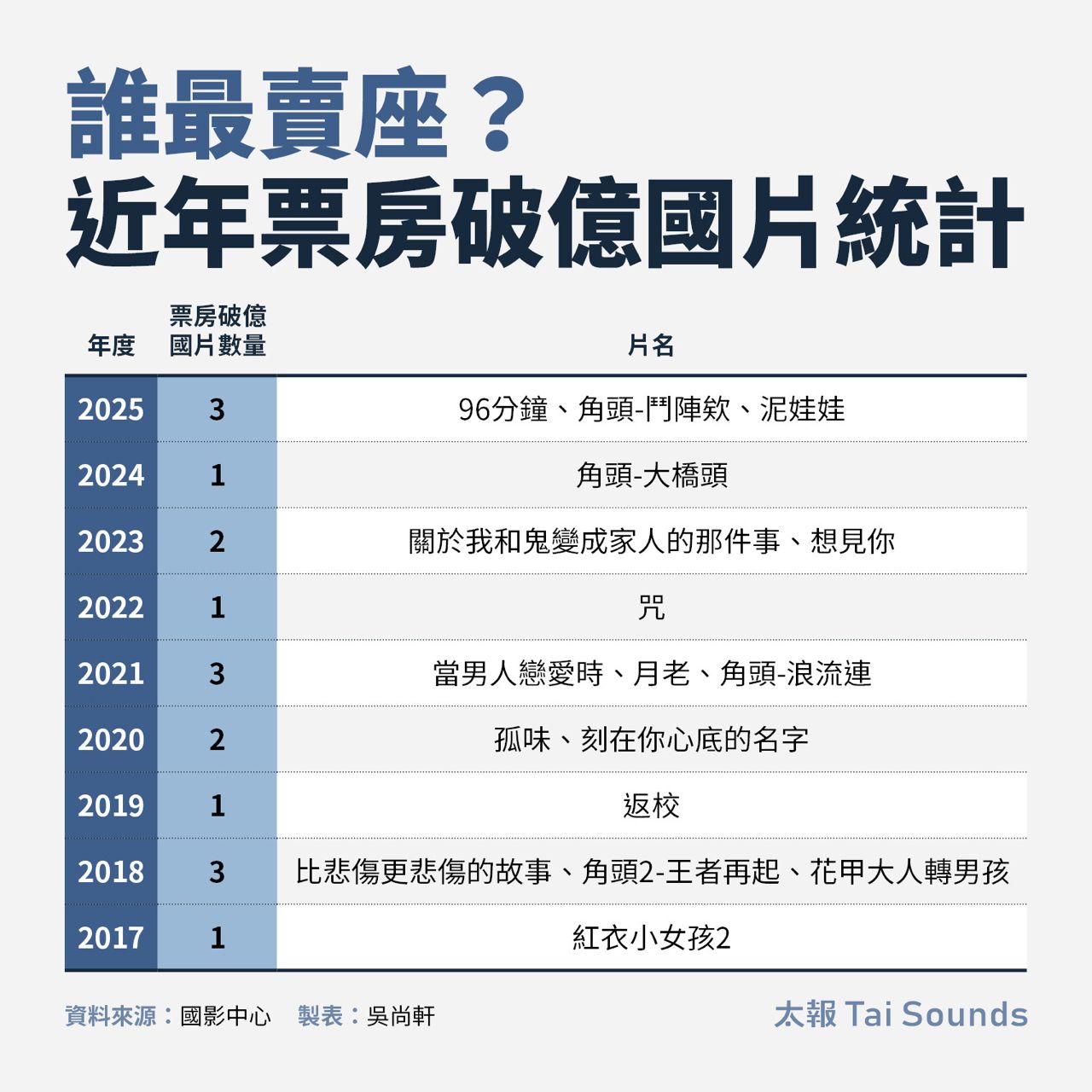 突破1億的賣座國片,發現每年破億電影多落在1至3部間,以剛結束的2025年來說,分別