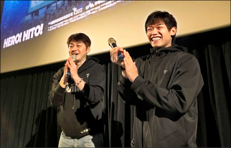 中職明星球員陳冠宇(右)驚喜現身《冠軍之路》映後,包括中華隊應援團長小白也帶動