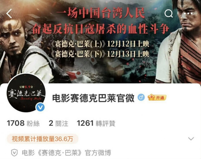 《賽德克.巴萊》重映,官方微博宣傳主打「一場中國台灣人民奮起反抗日寇屠殺的血腥