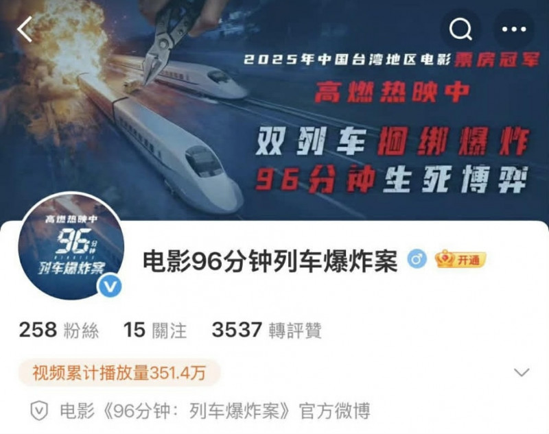 在台灣賣破2億大關的《96分鐘》在中國上映,微博宣傳寫著「2025年中國台灣地區電影