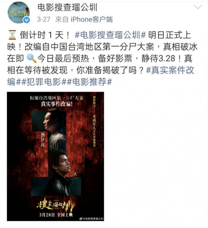 《搜查瑠公圳》昨在中國上映,微博主打「改編自中國台灣地區第一分屍大案」